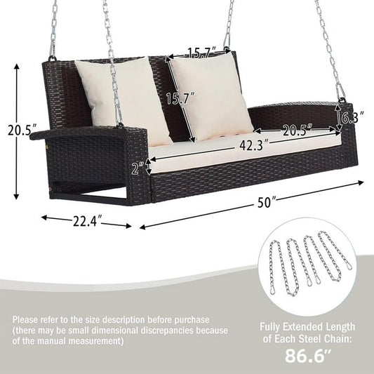 Hugrove 2 Person Wicker Hanging Porch Swing, Front Porch Swing Outdoor Chair with Soft Cushions and 2 Rustproof Steel Chains, Rattan Swing Bench for Deck, Backyard, Garden, Beige