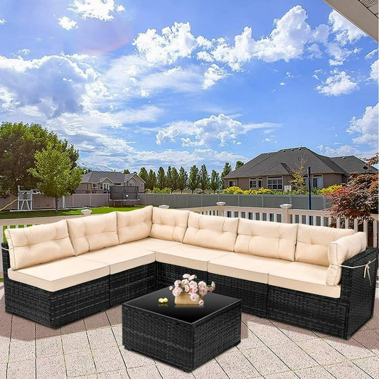 Hugrove 7 Piece Rattan Sectional Sofa Set, Outdoor Conversation Set, All-Weather Wicker Sectional Seating Group with Cushions & Coffee Table, Morden Furniture Couch Set for Patio Deck Garden Pool